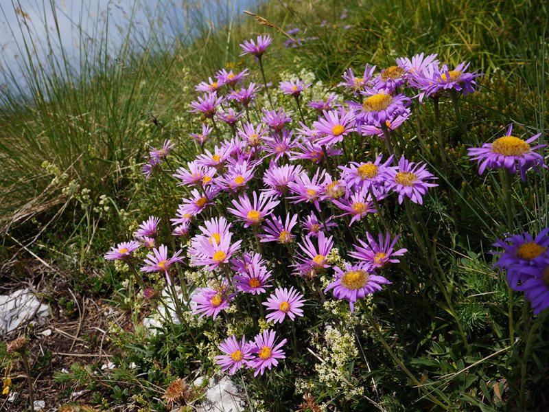 Astro alpino (Aster alpinus) - Famiglia Asteracee - Pianta erbacea perenne, con densa rosetta basale costituite da foglie a forma di spatola, ricoperte da una leggera peluria sulla pagina inferiore; in primavera dalla rosetta di foglie si eleva un sottile fusto, alto 15-20 cm, su cui sbocciano fiori singoli, a forma di margherita, di colore viola, con centro giallo o arancione. Fiorisce in giugno-luglio soprattutto nelle zone di media e alta montagna, sulle raterie sassose e sulle rocce.